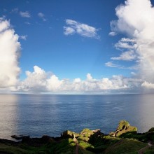 カルスト地帯(石灰岩の台地)と高麗芝の美しく調和した島の西南端に突き出た岬で、鋭く切り立った断崖と打ちつける怒涛の光景は圧巻である。