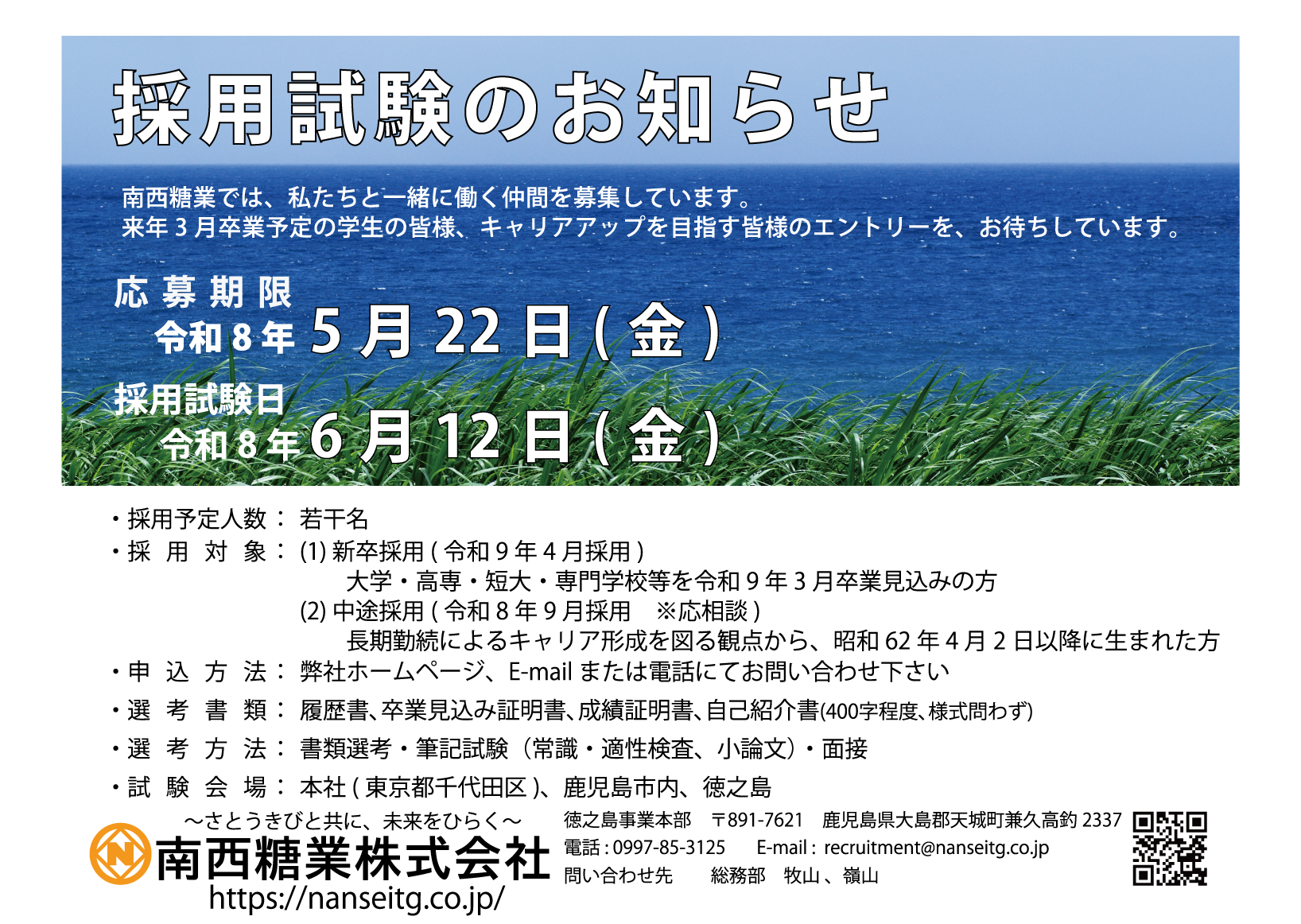 弊社では、新卒採用(令和9年3月卒業見込み)及びキャリア採用を対象とした採用試験を実施いたします。